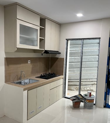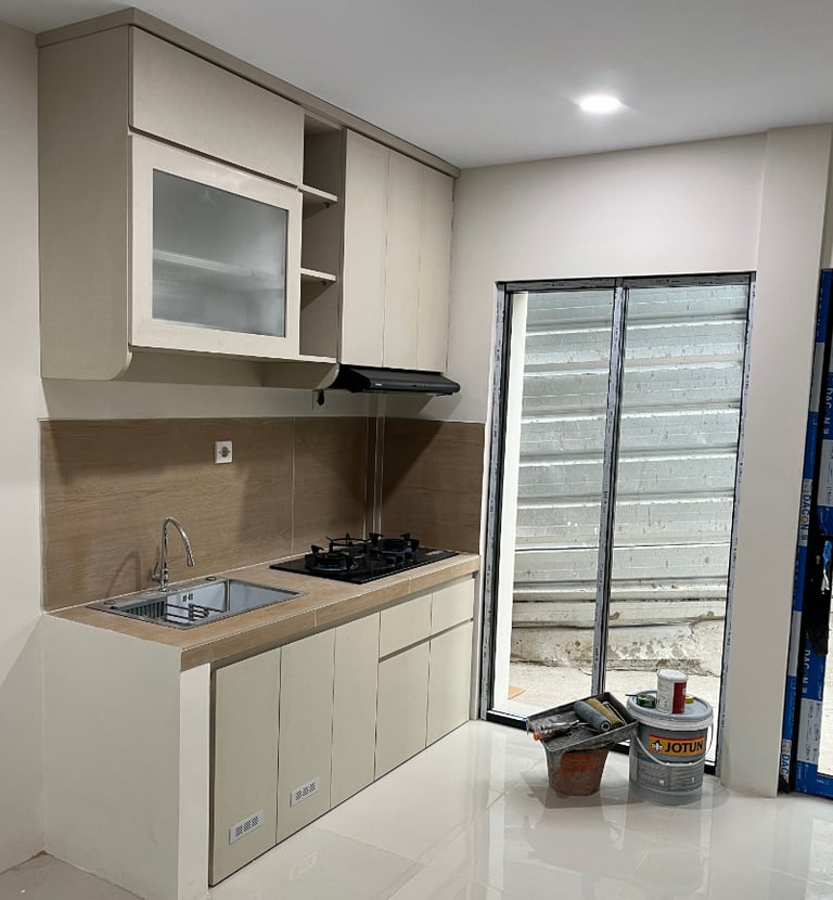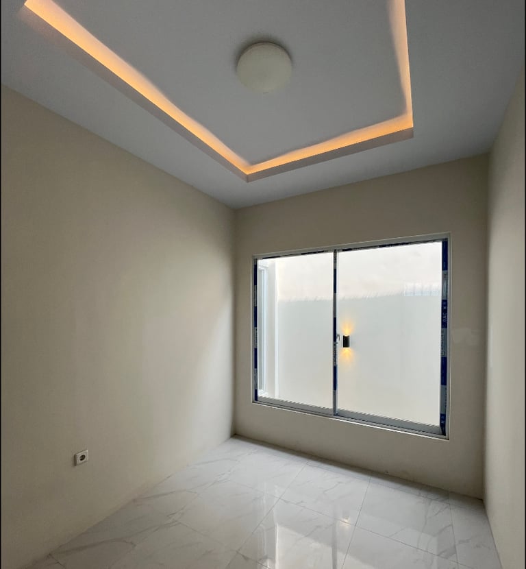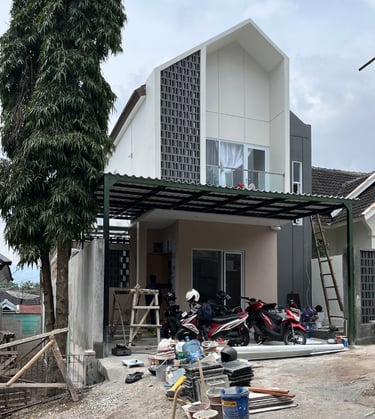 Hasilnya adalah desain rumah yang kompak dan fungsional, berbeda dari rumah developer pada umumnya yang sering kali kurang optimal pada luasan serupa. Rumah ini memiliki dapur dalam lengkap dengan kitchen set, ruang tengah dengan pencahayaan alami yang melimpah, serta setiap kamar dilengkapi jendela yang memadai. Meski berada di lahan terbatas, rumah ini tetap menyisakan halaman depan dan halaman belakang yang proporsional dan nyaman.