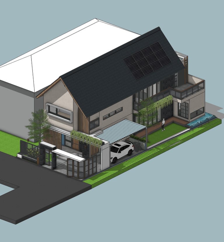Dimiliki oleh pasangan suami istri yang menginginkan rumah bergaya Scandinavian yang simple namun elegan. Dengan luas lahan 112 m² dan bangunan seluas 120 m², rumah ini dirancang dengan konsep open space yang menghubungkan ruang tamu, ruang keluarga, dan dapur, menciptakan suasana hangat dan nyaman.
